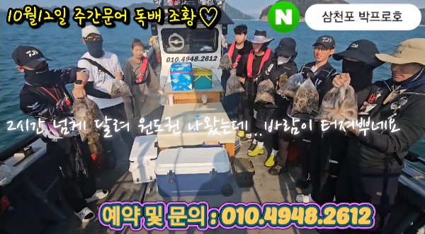 |  #조항정보 12일 주간문어 독배 조황♡ 드디어 박프로 전문분야~!  원도권에 마릿수~ 사이즈 둘다 만족할만큼 나왔네요~^^ 원래 독배는 안주는 박프로~  단골분들과 지인분들 독배 첫 출조하고 왔네요~^^ 독배도 메리트가 있네요~~♡♡ 오늘은 야간반이 없어 2시간 넘게 달려~! 원도권 조황 확인하고 왔습니다~^^ 솔직히 바람만 아침부터 안터졌으면? 망탱이 터져나갈뻔 했네요ㅡㅋ 아직은 작은 사이즈들이 나오는곳도~ 있지만~  점점더~  덩치를 키울꺼라 생각하니~  올해 겨울 시즌도 기대가 됩니다~^^ 요즘 많은 배들이 주.야간을 돌고~  콩들도 쓸어가버리는 판국이라..많이 걱정했는데... 아직은 살아있는곳들이 제법있네요~~!!! 희망이 있습니다 ㅋ 오늘  첫 낚시 입문자분들도 계시고~ 초보조사님들도 계셨지만~!  독배 장점이 보이네요~~^^  초보조사님들이 더 활약해버리고~~!!! 너무 즐겁고~  배도 부르고~ 좋은 조과로 마감까지~~!!   다들 감사하고~  사랑합니다♡           *** 삼천포 박프로호 예약 안내 *** 예약문의 : 010-4948-2612 오시는길 : 경남 사천시 팔포3길 56-35 홈페이지 : https://3004parkpro.sunsang24.com/ 유튜브채널 : https://youtube.com/@fishing_pro_park 네이버 밴드명 : https://band.us/@3004parkpro 네이버 블러그 : https://blog.naver.com/pmw8371 경남 사천 팔포항 삼천포 박프로호를 찾아주셔서 감사합니다. 문어 전문 최고의 선사가 되는 그 날까지! 찾아주시는 조사님들을 위해 죽어라 문어만 팝니다! 금어기는 빼고...! 먼 길 찾아주신 조사님들을 위해 항상 최고의 포인트 안내와 빠른 이동 출조 관련하여 궁금하신 점은 언제든지 편안하게 연락주시기 바랍니다. 감사합니다.   | ||
