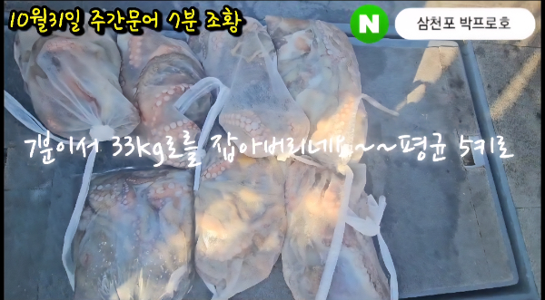 |  #조항정보 31일 주간문어 7분 조황♡ 오늘은 7분 모시고 다녀왔습니다~^^ 어제와 같이~  오늘도 사이즈들이 덤벼주시네요~^^!! 7분이서 총 약33kg~ 평균 약 5kg씩 가져가시네요~~!! 대단~~!! 2.79k, 2.28k  두마리나 나와주시고~^^     낚시 첨하신분도~~ 망탱이 가득~~!! 1k오바는 몇마린지도~~모르겠고~~!! 강풍이 불어도 나올놈은 나오네요~~^^ 다들 고생하셨습니다~♡        *** 삼천포 박프로호 예약 안내 *** 예약문의 : 010-4948-2612 오시는길 : 경남 사천시 팔포3길 56-35 홈페이지 : https://3004parkpro.sunsang24.com/ 유튜브채널 : https://youtube.com/@fishing_pro_park 네이버 밴드명 : https://band.us/@3004parkpro 네이버 블러그 : https://blog.naver.com/pmw8371 경남 사천 팔포항 삼천포 박프로호를 찾아주셔서 감사합니다. 문어 전문 최고의 선사가 되는 그 날까지! 찾아주시는 조사님들을 위해 죽어라 문어만 팝니다! 금어기는 빼고...! 먼 길 찾아주신 조사님들을 위해 항상 최고의 포인트 안내와 빠른 이동 출조 관련하여 궁금하신 점은 언제든지 편안하게 연락주시기 바랍니다. 감사합니다.   | ||